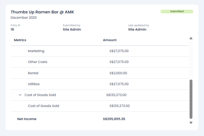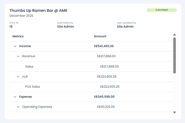 - Click Submit to finalize the Finance Entry, or Save as Draft if you need to edit it later.
