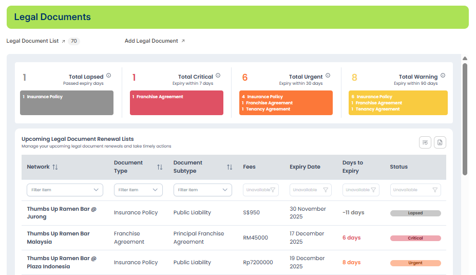 - Status 👉 Indicates whether the document is Lapsed, Critical, Urgent, or Warning.
