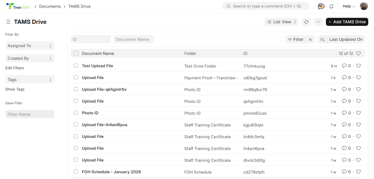 TreeAMS Drive is a centralized storage space that automatically collects all files uploaded through the File Upload Task or any upload feature in TreeAMS.